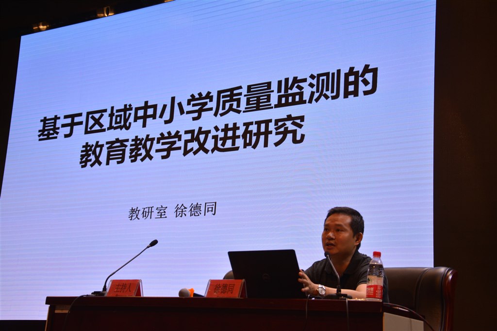 课堂是实施教育的主战场,常州市教科院的教研员徐德同就《基于区域中小学质量监测的教育教学改进研究》的研究背景、研究综述、教学与评价改进这三方面向教师们展示了教学工作的基本任务以及教学内容的选择误区。教师们不禁受到深深启迪:在新的时代,要具备新的方向,立足发展核心素养,提升课堂教学品质,最终实现立德树人。