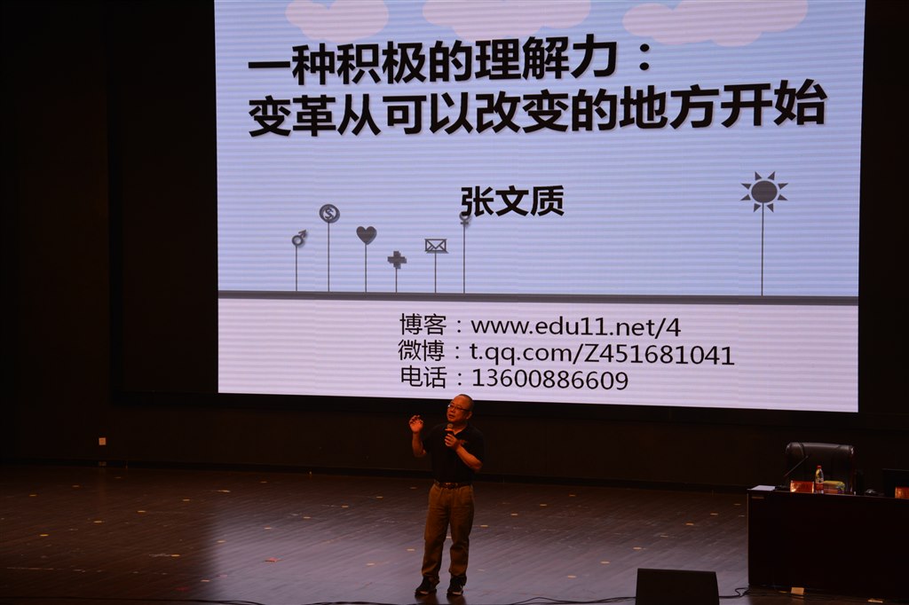 人类有教育,就应该有教师的存在。教师是有效地促进学生发展的“工具”,教师的素质是决定教育质量的关键。那教师应该具备怎样的素养呢?《明日教育论坛》主编张文质提出变革从可以改变的地方开始,教师要具备一种积极的理解力。要学会理解学生具备独特性、学会理解学生家庭具备多样性、学会理解教师自身的恐慌感……张主编通过与自己孩子的相处,向教师们展示了教育是一种慢的艺术,教师要具备钝感力,不去判断,多去唤醒、鼓舞和激励学生,要学会将职业转变为事业,最终成就为“命业”。五校区的教师们在张主编的激情演讲中不禁受到感染:要做一个永久的学习者和实践者,守住内心的火种,不断追求与呼应!”