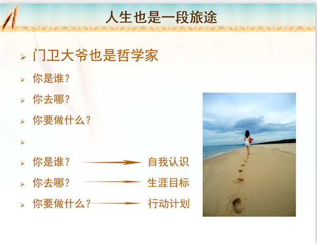 各班展示的同学们善于发挥自己的优势、敢于正视自己的不足、为了梦想愿意付出不懈的努力、制定执行具体可操作的计划,并且对自己的理想职业都进行了较为深入的调查了解。这些无不让我深受启发,对于个人生涯的规划也愈发明朗起来。