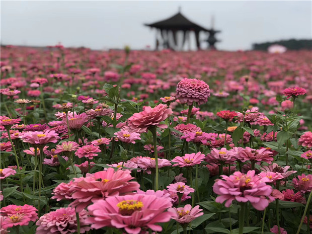 水榭亭台,曲径通幽,涧水禅意,流水淙淙。拈花一笑,看那楼阁半隐半现,古色古香;静心止语,感那禅意缥缈虚无,如真似幻。雨后的清风拂过,花海涌起微波,溢出了充满希望的生机勃勃,有星星点点的古老小亭,藏匿在花的海洋,亭中悬挂的旗幡摇曳飘荡,随风起舞,别有一番意味。