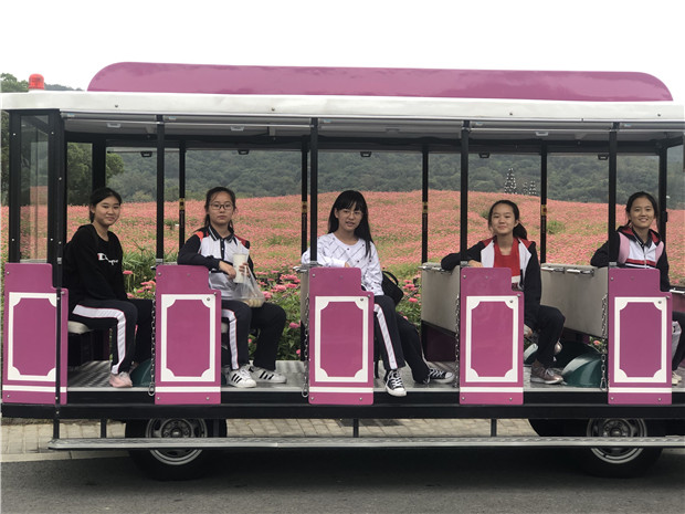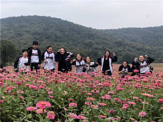 来到拈花湾小镇门口,放眼望去,树叶尽染,鲜花凝芳,天地一色。这里有清雅浩瀚的梵天花海,在时光中晕染禅意。大片的波斯菊,橙黄灿灿,亭亭玉立,轻摇曼舞;小朵的格桑花,紫粉脉脉,盈盈欲滴,娇羞欲语。同学们三五成群,或驻足闻香,或追逐嬉戏,或合影留念。花开漫山,轻轻摇曳,时光静好,幸福满满。