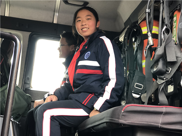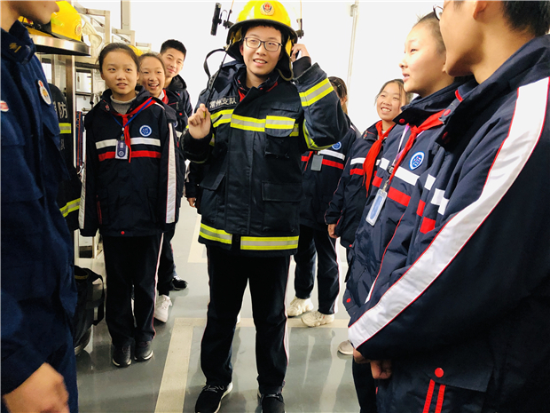 同学们在消防员叔叔带领下来到了两辆鲜红的救火车边。别看它们和一般的汽车没什么两样,其实每一部分都“暗藏玄机”。车的四面八方都可以打开,里面装着各种各样的灭火工具,以便在第一时间灭火救援。大家仔细聆听着消防队员的介绍,好奇打量着这些庞大却先进的工具,真是开了眼界又长了见识。