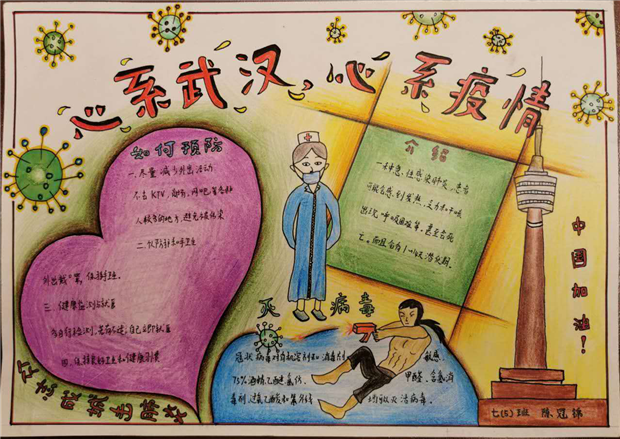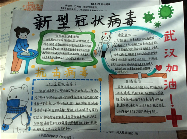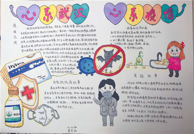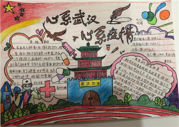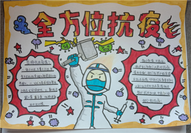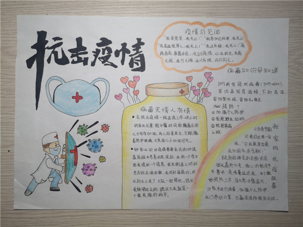 面对这场没有硝烟的战争,河海中学开展了“同心同创,共抗疫情”主题绘画、书法、小报活动。心中有爱、手中有笔的同学们纷纷行动起来,积极创作“抗疫”作品,以“艺”抗“疫”,为打赢疫情防护战加油鼓劲,让我们一起来看他们的作品吧。