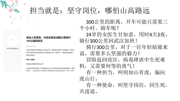 李晨玥老师的一番话直击内心,道出了这次疫情中我们青年学子的青春真谛。她说:“一个人有多大的责任和担当,就有多大的舞台和机遇;如果没有了责任和担当,将面对人生难以承受之轻。”这次课程的目的就是让我们在抗击疫情斗争中深化理论认知;思考疫情大考告诉我们什么;总结历史经验,增强必胜信心。