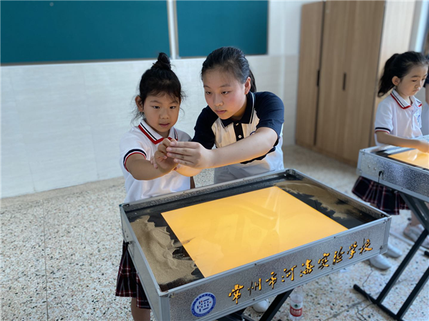 在创作沙画的过程中,小同学有一个画画的手势学不会,于是我学着老师的样子,耐心的教她。看着她认真专注的眼神,心里顿觉一种莫名的感动,或许是作为大姐姐和小老师的那份责任和神圣感;看到她画出了美丽的沙画,我的心中也油然而生出一种欣慰和自豪感。