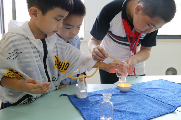 老师实验台上的瓶里怎么开始冒气泡啦。科学实验真有趣呢!既能学到科学知识,还能让水娃们自己动手操作,可谓一举两得。