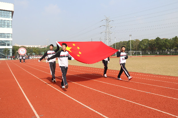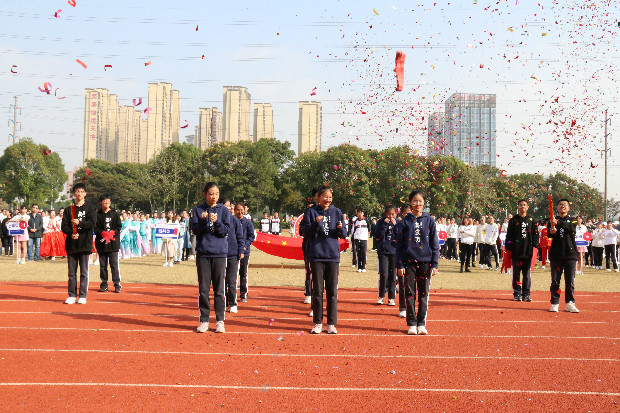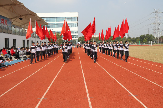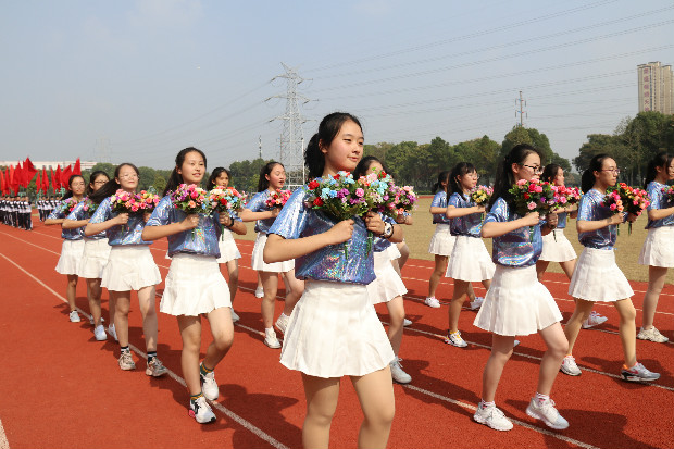 在铿锵有力的进行曲伴奏下,运动会国旗队、会徽、鲜花队、裁判员代表方阵迈着整齐的步伐,气宇轩昂地朝着主席台走来。