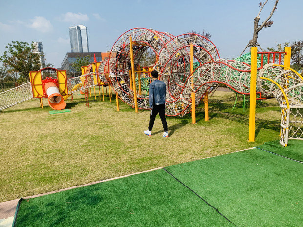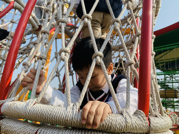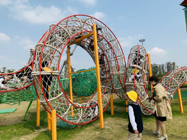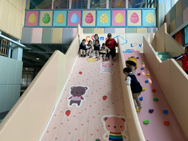 这条滑梯好长啊!我们一起滑下去吧!一起滑,勇气和快乐都会加倍!