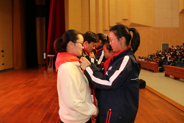 少先队员代表们满怀欣喜为出席仪式的中队辅导员们戴上了鲜艳的红领巾,每个人脸上都洋溢着幸福的微笑。