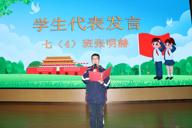 中队长代表张明赫同学发言,红旗飘扬,作为新时代的少先队员,要信心百倍地去迎接各种挑战,努力做祖国和人民事业发展的接班人。