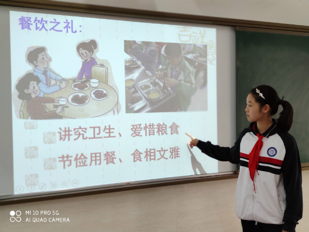 从八礼四仪到校园文明,从个人小家到校园大家,我们都学会了如何做一个有文明,懂礼仪的中学生。作为少先队员的我们,在“小家”注重个人礼貌、学会文明交谈、做到文明观赏……在“大家”则要懂得尊重国和党,懂得尊重老师同学,懂得保持环境卫生……在今天的主题班会上,我们铭记八礼四仪带给我们的学习收获与成长快乐。让我们一起与文明礼仪同行,一起开启美好新天地!