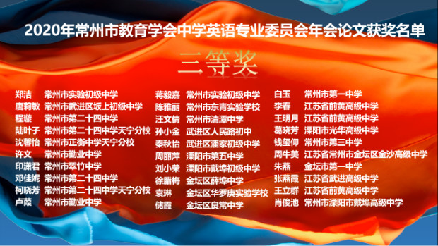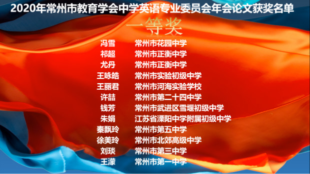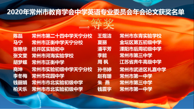 常州市教育学会中学英语专业委员会理事长、常州市河海实验学校赵卫勇校长充分肯定了会员们在过去一年中的各种成果,点赞大家聚力课题研究、聚焦课堂转型,用教育科研不断引领专业发展、助力教师成长,同时也为老师们指明新方向、增添新动力。接着,赵校长宣读2020年英语年会论文获奖名单,我校王丽君、张文雯老师分别荣获一、二等奖。