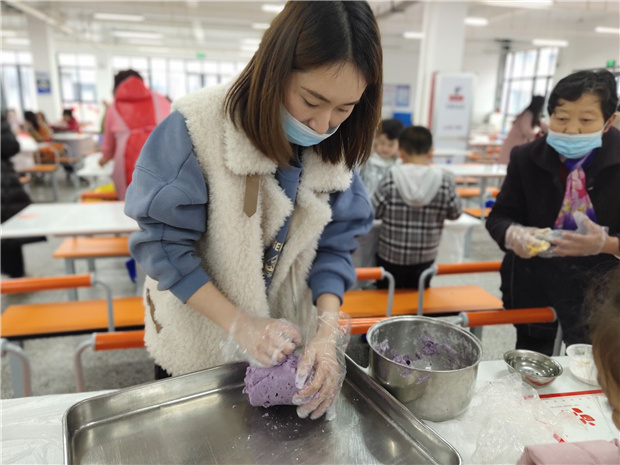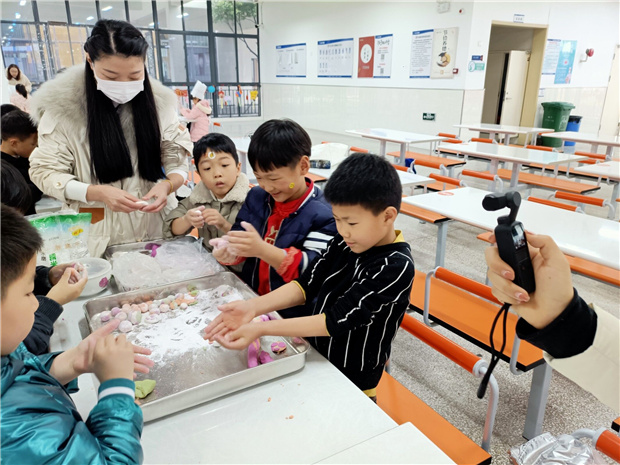 撩起衣袖,小水娃们在家长老师们的教导下搓起元宵来,在软软的面团上揪下一小团,快用双手搓起来。