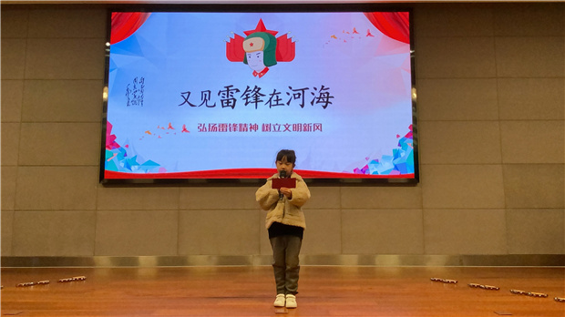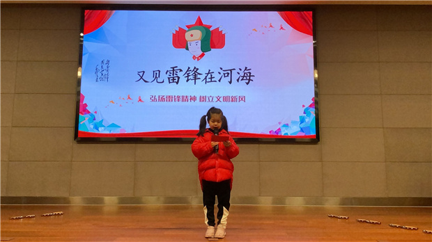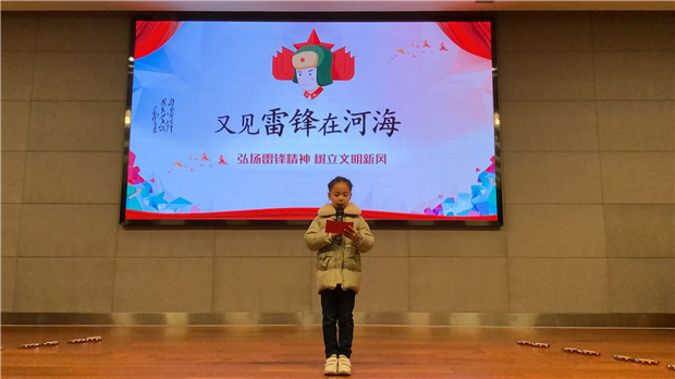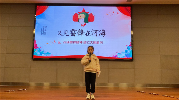接着,主持人和小朋友一起聊起了身边的“雷锋故事”。是啊,在我们河海实验学校里,也有很多热爱集体、助人为乐的小“雷锋”,你瞧,他们已经自信地走上了舞台,要和大家一起分享呢。