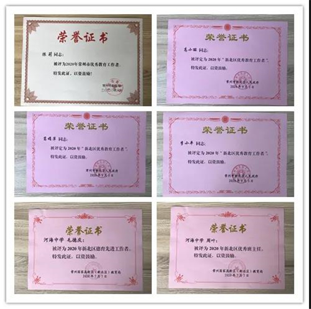 他们有收获:仅仅2020年第一学期,我们就看到他们专业发展再上一层楼:王丽君、薛明波老师被评为“常州市骨干教师”,芦启顺主任被评为“常州市高级班主任”;看到他们获得累累荣誉:陈莉老师被评为“常州市优秀教育工作者”,葛娟萍、高小丽、李小平老师被评为“新北区优秀教育工作者”,周叶老师和毛德庆老师分别被评为“新北区优秀班主任”和“新北区优秀德育工作者”;看到他们在比赛中披荆斩棘:陈菲老师获得常州市信息化教学能手特等奖和江苏省的二等奖,并和陈莉老师一起收获新北区信息化能手大赛的一等奖……可以说他们成长的每一步都是坚实的,收获也是沉甸甸的。