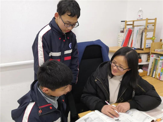 17:30—18:00之间,很多老师去食堂吃晚饭了,可是,在九年级办公室,我们却看到了一群年轻姑娘们,一手抓着饼干,一手拉着孩子纠正发音。
