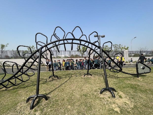 来到楼下的游乐场,看到造型各异的器械和迎风转动的风车,小朋友的眼睛里都在放光呢,一定很想爬到恐龙爬架的高处看不一样的风景吧。