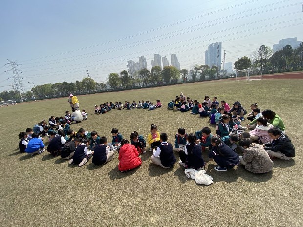 诶,小朋友又是围成一圈,又是两三个凑在一起的,是在干嘛呢?原来“星”“河”的小朋友在交流小学生的生活呢。