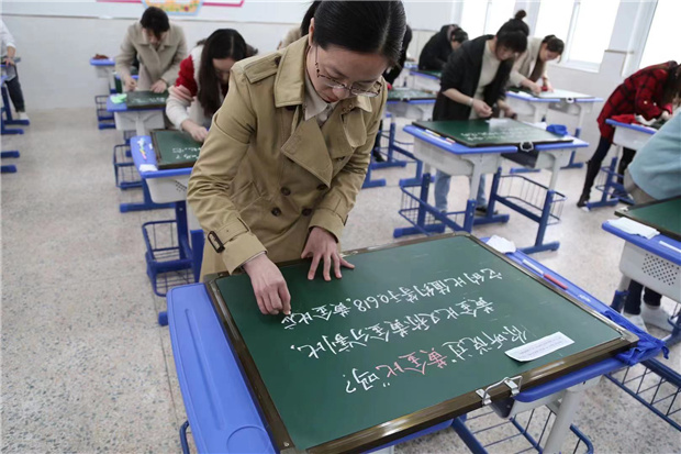 基本功大赛是各类比赛中项目最多、要求最高、难度最大的全封闭式比赛,它涉及理论素养、学科知识、即兴演讲、粉笔字、教学设计、课件制作和考堂教学等七个方面。作为学校中层,蔡老师白天除教学外,日常事务更多。丈夫在外地工作,每晚只有把女儿哄睡后才有属于自己的时间。去年12月,蔡老师刚通过常州市小学数学学科带头人评选。来不及喘口气,蔡老师便为自己制定了备战基本功大赛的计划。假期放弃所有外出活动闭门学习,通读教育理论,背诵课程标准,坚持每天做题,潜心教学设计,苦练粉笔字……长时的伏案学习导致颈椎腰椎病复发,但她始终咬牙坚持,即便走路也在默默地背诵着、思考着……