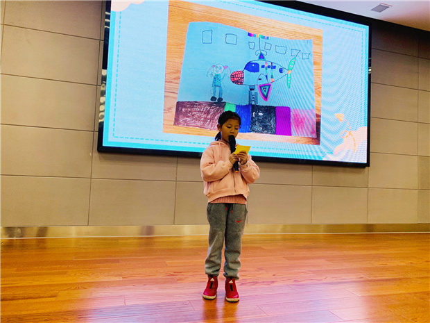 郭梓桐向大家展示了自己的画作:“飞机好大呀,不仅有大大的翅膀,还有十个很大的轮子。听着叔叔的讲解,我都想开着这么厉害的飞机,在天空中自由飞翔啦。”
