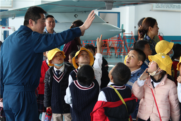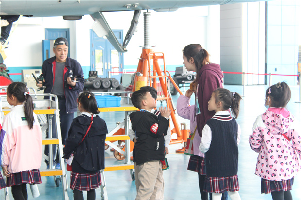 来到机场,小朋友们第一次近距离接触到在天上飞的“大鸟”。“特聘”的专家——军人叔叔为大家详细讲解了飞机的构造,对小朋友们提出的各种问题有问必答。在交流中,小朋友第一次知道原来飞机也分好多种,而我们参观的就是一架既能给其他飞机加油,又能装武器的加油机。
