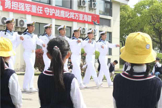 第二站,小朋友们走进了海军叔叔的大本营。在这里,海军叔叔们行云流水般的操练让他们阵阵惊呼:“他们这么多人就像一个人似的。”“我只听得到他们的手擦过裤缝的风声。”“他们的背挺得好直呀,我也要向他们学习。”“老师,我们坐的小板凳也排得很整齐呢!”