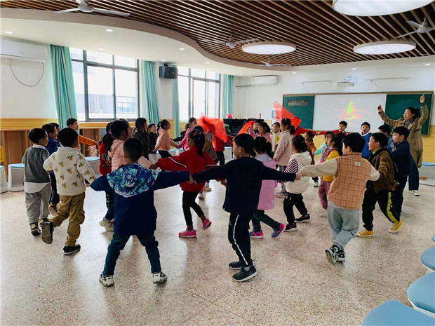 音乐课上,秦老师与小朋友们一起领略了彝族风光,唱响了《彝家娃娃真幸福》,舞动的红丝带将孩子们领进了彝族盛大的火把节。孩子们在“火把节”上载歌载舞,热闹非凡。