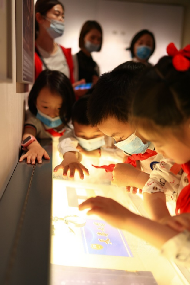 孩子们从大厅左侧徐徐步入展厅,可以看到通过历史图片、塑像、裸眼3D、时空相机、数字油画等多种艺术与科技表现形式再现的张太雷同志的光辉一生,亮晶晶的眼睛中充满了好奇与敬仰。