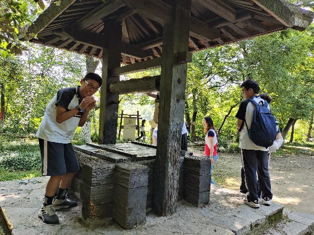 我们小组沿着小路,走过一座木桥,曲径通幽处,我们看到了关雎桥。五月底荷花还未长成,池塘中央便长满了翠绿的荷叶,我们还体验了钓小龙虾的乐趣。再往前走,穿过古色古香的木门,就来到了孙武草庐,木制的建筑隐藏在郁郁葱葱的树木中,颇有种隐居避世的味道。古典的韵味、悠久的历史文化在淹城得到了充分的体现。此次研学,收获颇多。