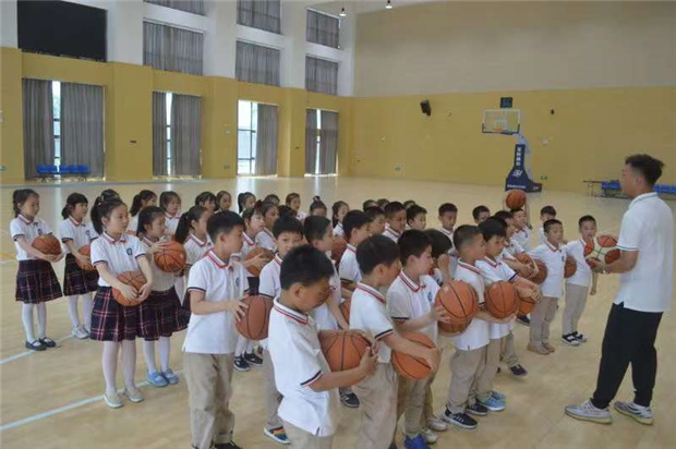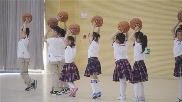 一(3)班的小鲸鱼们跟着李聪老师一起在篮球世界里遨游,抱球鸭子走、抱球垫脚走、左右手原地运球……调皮的篮球在李老师的指导下,同学们运的得心应手、乐在其中。