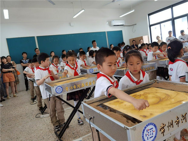 今天一(2)班全体同学一起跟随小米老师走进颗粒艺术,挥沙作画。孩子们以沙作笔,或是扬洒造景或是细致勾勒,一捧细沙,一笔一划,不一会由小兔子、小草、太阳……组成的场景便跃然沙台,令在场的家长惊叹不已。