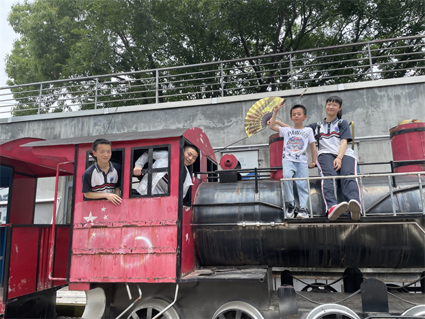 民国时期的火车现在早已埋没进时代的洪流,但这儿还遗留着一节火车头,同学们纷纷好奇地参观,并与火车头留影纪念,即使年华老去,也有那么一群朝气蓬勃的朋友,踏破时代交界,领略魅力古今。
