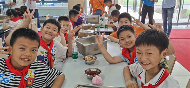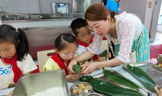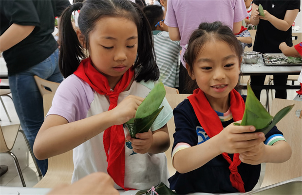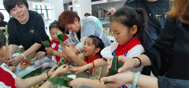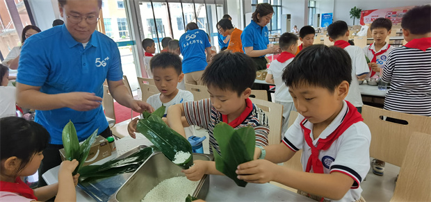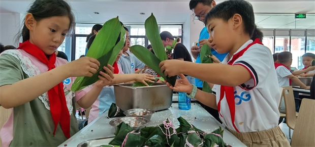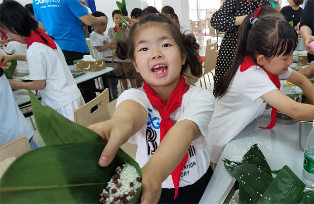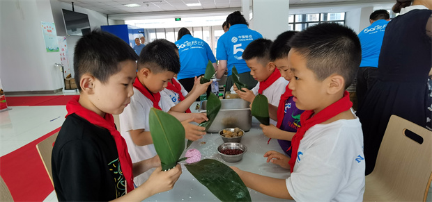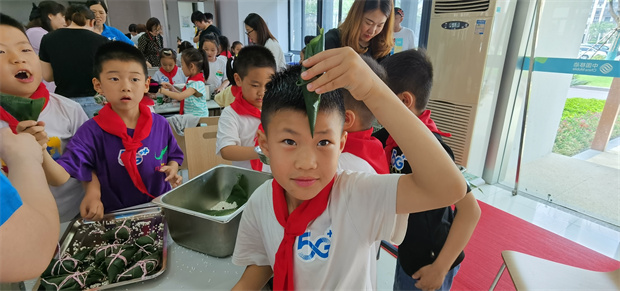 参观完5G创新体验中心,孩子们跟志愿者一起开启浓情端午活动。志愿者给孩子们讲述了端午节的由来是为了纪念诗人屈原,端午有包粽子、赛龙舟等习俗,告诉孩子端午节已列入《人类非物质文化遗产代表作名录》,是中国首个入选世界非遗的节日。