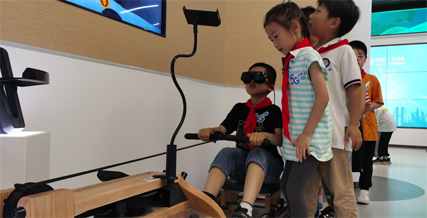 接下来体验的是5G VR划船,它能够将各设备终端进行分布式联动,在体验过程中进行计算,全面记录分析我们的运动数据,在体验结束后会生成运动结果,让我们更加科学有效地运动健身。