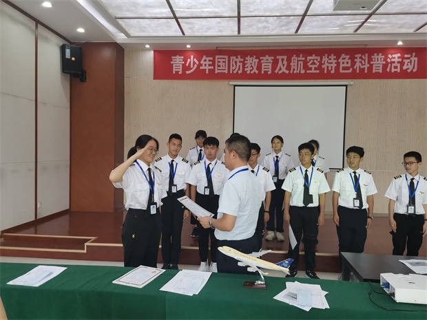 第二环节是航空知识学习,教官带领我们进入会议室,给每位同学带上肩章。落座后学习航空理论知识和进行国防教育。在互动环节,同学们与教官就飞行原理、飞机构造、发动机和电子系统进行了深度交流。