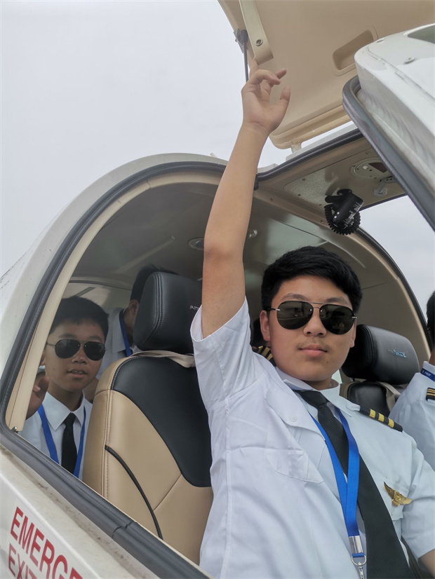 下午则是上机训练和模拟飞行。登上真飞机进入驾驶舱,带上墨镜,坐上机长和副机长位置的我们仰望天空,觉得可以驾驶这架飞机飞上蓝天。那种感觉真是棒呆了!