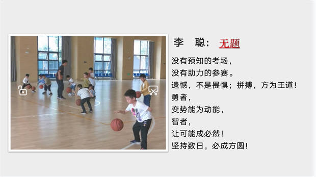 李聪,区小学体育教师基本功竞赛三等奖获得者:在这次比赛中我学到了很多,而我在赛后应该更加明确自己的优势和短板。重新出发,再接再厉,力争自我超越!