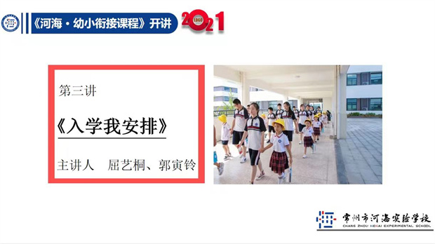 自2020年8月河海实验学校转型成九年一贯制以来,“衔接”即成为学校重点研究课题之一。2020年8月27日,河海实验学校小学部全体教师走进银河幼儿园,聆听原常州市副市长居丽琴女士的专题报告《听奶奶讲故事:在史上最长寒假的观察与思考》。之后,学校对衔接课程中的“幼小衔接课程”进行了“1+3+N”的顶层设计并付诸实施。