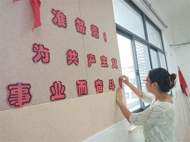 二(4)万欣嘉:我们在班级分享自己在假期里的成长和收获,中队墙上鲜艳的红领巾,时刻提醒我们是一名光荣的少先队员!