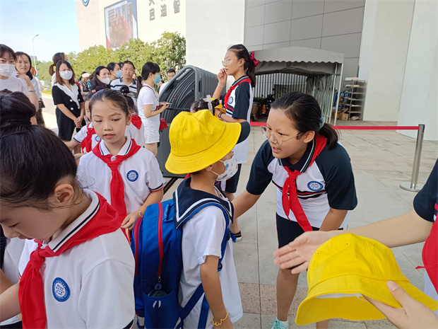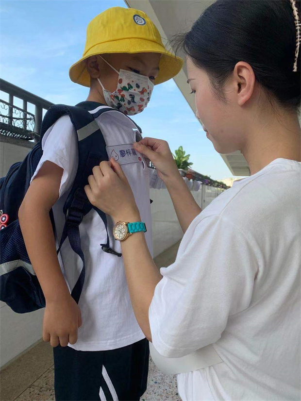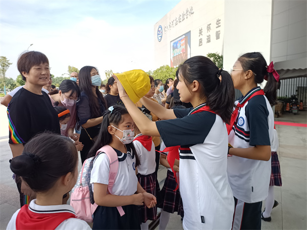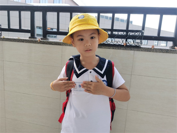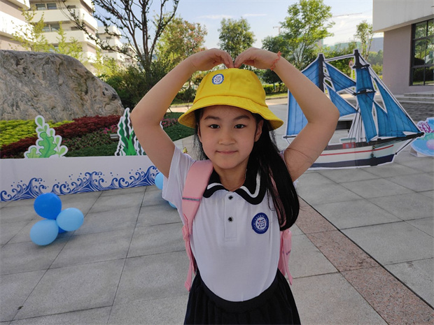 看着高大气派的校门,我还有些紧张,不过,妈妈教我深呼吸,放轻松。呀,可爱的小姐姐来了,轻轻牵起我的手,问清我的班级后,带我走到志愿者大姐姐面前。我收到了第一份河海礼——“悦纳·七色光”小水手礼帽,小哥哥则贴心地给我戴上了驱蚊手环。