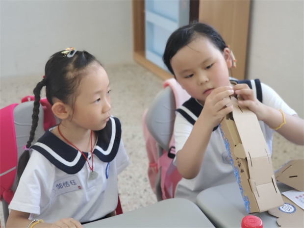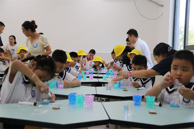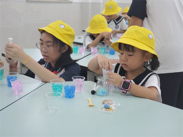 科学实验:“哇,是我们喜欢的水宝宝呢!”看到几大盒水宝宝,我激动地叫了出来。谁能想到,老师居然会用这个做实验!我们的眼睛紧盯着老师,生怕错过了任何一个步骤,再小心翼翼地制作,遇到问题,志愿者哥哥姐姐还会提供帮助。不一会儿,人人手中都有了一个微型的“海底世界”。科学课也太神奇了吧!