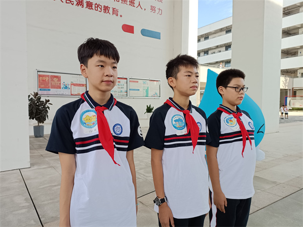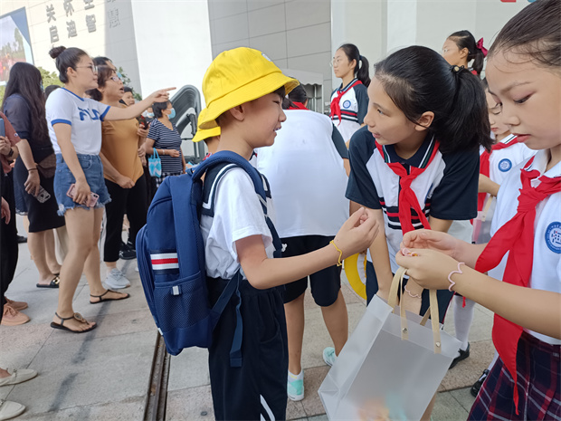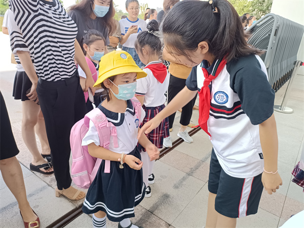 嘿!这两个笑得这么甜的人物是谁呀?可不就是我们的小水娃“形象大使”么。“形象大使”旁边的是中学部的姐姐,还有二年级的小哥哥小姐姐。听老师说,她们作为志愿者,早早就来到学校做准备,只为迎接我们的到来。