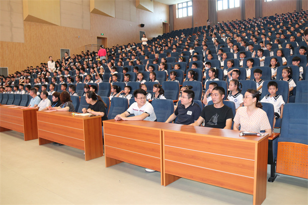 开学典礼分为两部分,首先是集中典礼,你瞧,一二年级的小水娃们和初中部的学子们齐聚八百人报告厅,他们坐姿端正,神情专注,共同聆听赵校长新学期致辞。