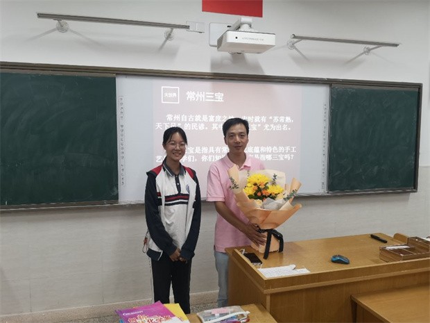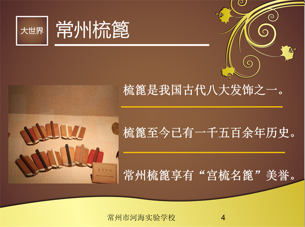 九(2)班的家长向同学们介绍了常州三宝。常州自古就是富庶之地,宋时就有“苏常熟,天下足”的民谚,其中“常州三宝”:梳篦、留青竹刻、乱针绣尤为出名。同学们欣赏着精美的图片,听家长娓娓讲述常州的物质文化遗产,享受了一场文化盛宴。