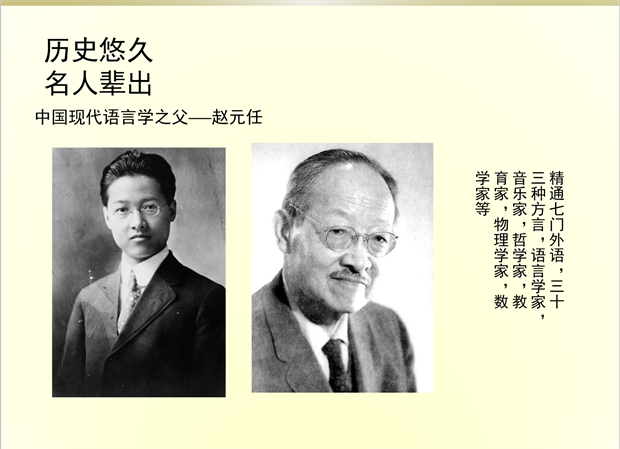 九(9)班展示了中国现代语言学之父——赵元任先生的生平,讲述了伟人一生精彩的故事,勉励大家向先生一样,晴空扶摇排云上,同引豪情到碧霄。