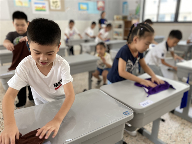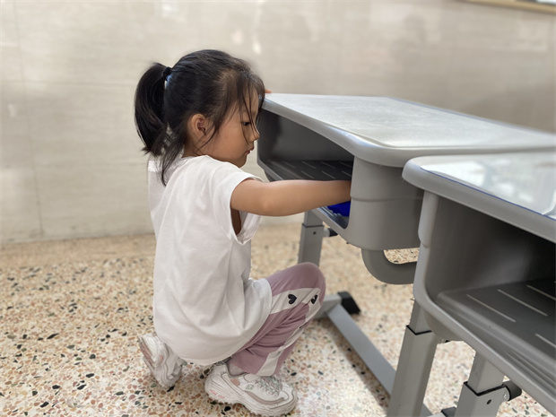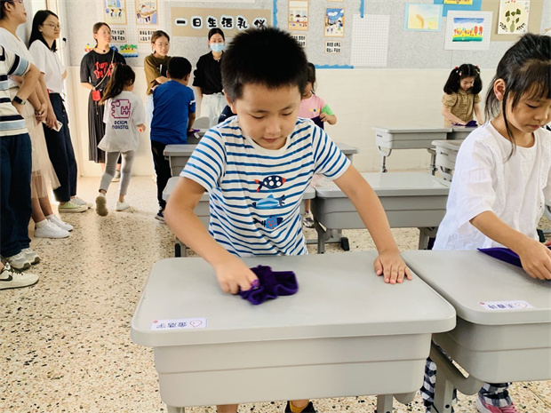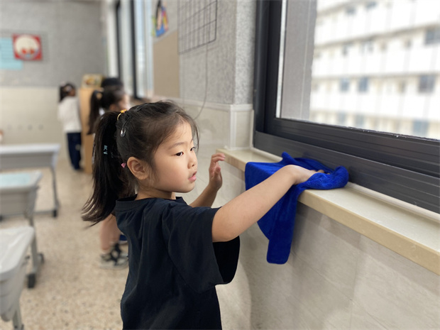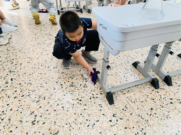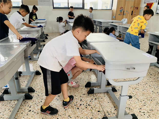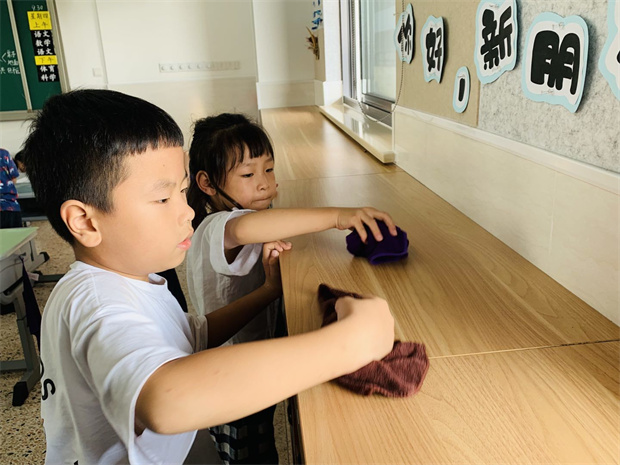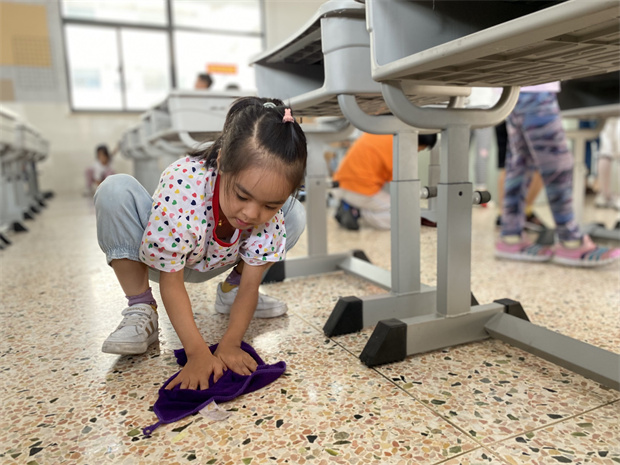大扫除第一步——理清桌面和桌肚。小水手们迅速把文具送回“家”,把书本收进书包,桌肚桌面全部清空。全程小水手们没有一点嘈杂的声音,动作还很熟练,一定是平时养成的好习惯吧!