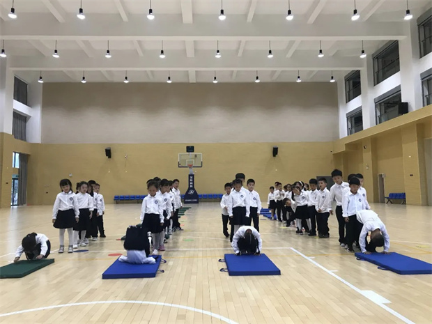 首先,由王洮洮教师执教一年级《前滚翻》。课始,王老师用形象的游戏和欢快的韵律操带领孩子们在游戏中充分热身。课中,她用标准的动作示范前滚翻,并通过篮球和长方体盒子的对比实验,引导学生发现“一蹲二撑三低头,团身抱膝像个球”的动作要领,加深了学生对动作技能的快速记忆。随后,王老师把课堂还给学生,引导两人小组合作练习,不仅增加了课堂的练习密度,也使学生在运动员和裁判员的角色体验中掌握前滚翻技能,担当伙伴式责任,感受体操的魅力。