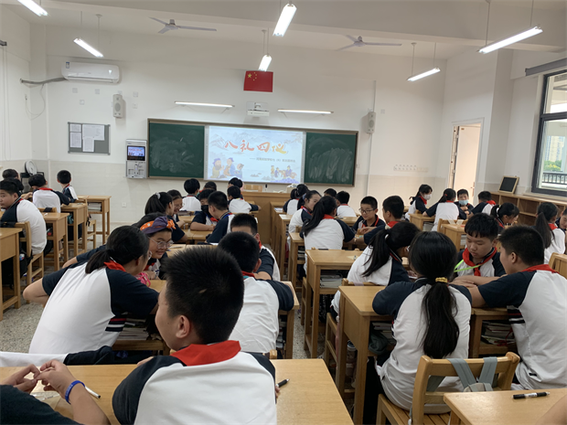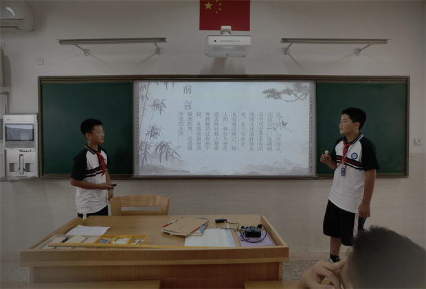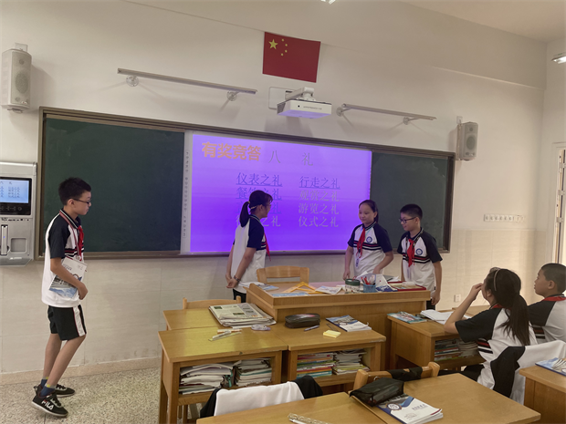更吸引人的是丰富多彩的形式。你看,有庄严肃穆的宣誓仪式,妙趣横生的小品,蕴含知识的问答,互动性强的情景剧……每个教室里都充满欢声笑语,让同学们在积极参与中明确各种礼仪,不断规范自身言行。