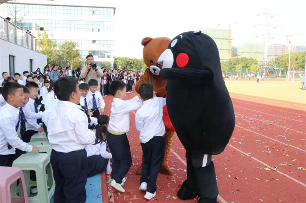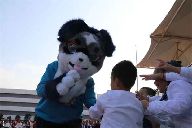 瞧瞧是谁来了?哦!原来是初中的哥哥姐姐们扮成大熊的模样,来给水娃娃们送糖哩!