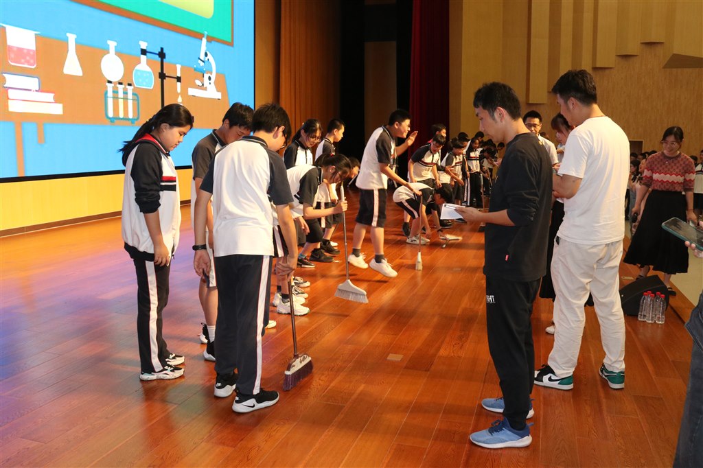 让人眼前一亮的,还有即兴比赛,学生们积极参与互动,场面热闹非凡,惊喜连连,余韵满满。无论是立扫帚还是立矿泉水瓶,都让我们看到了同学们相互合作、共同努力的团队意识。